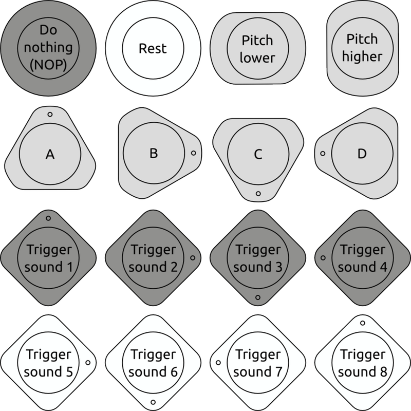The magnetic system on the new pattern matrix consists of four hall effect sensors on every location you can place a block. There are four unique ways you can arrange the magnets - which means four types of programming block are possible. As we want to reuse these physical blocks for various uses and programming languages, we decided to use abstract shapes to denote the block types to begin with. Each of the four blocks can be rotated and flipped to give 32 total possible orientations, or symbol 'tokens':