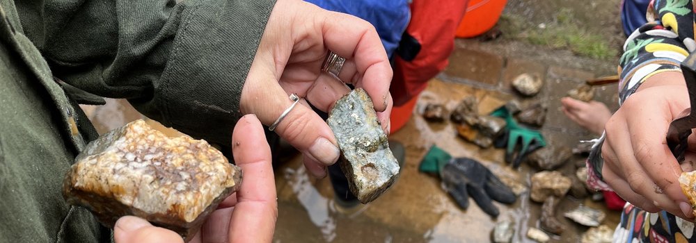 One of the nice things that happened when the clouds cleared and the view opened up, was being able to point Carn Marth in the distance, which was the high point of the mass of granite (a base of a now eroded mountain chain) the heat from which had caused the shiny mineralisation we were now pulling out of the rocks and looking at up close. We then returned to the Rock Lab to clean and examine the material we had found, trying to identify it and decide what was good for taking home.