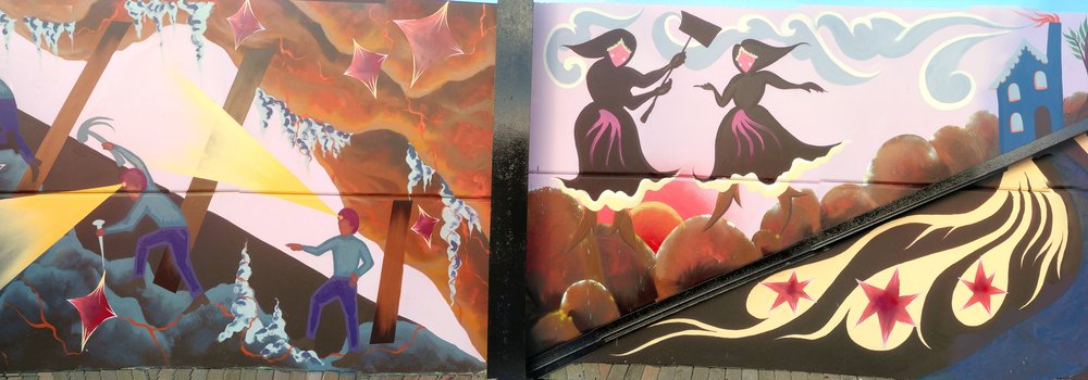 This year we had the opportunity to do a lot of extra activities for the organised atoms project beyond our family workshops. Firstly we wanted to leave something behind related to the project for United Downs Raceway who have been our wonderful hosts for the past two years. We commissioned muralist and illustrator Natasha Watson to design and produce a mural based on the project and the history of Ale and Cakes mine. She took part in one of our workshops as research for the mural, so she had experience of cracking open rocks and finding veins of mineralisation and crystals, and it was interesting to see how this inspired her work, featuring miners, bal maidens, yellow veins of chalcopyrite copper ore, crystals and rocky textures.